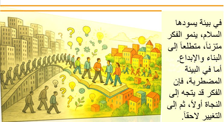 في بيئة يسودها السلام، ينمو الفكر متزناً، متطلعاً إلى البناء والإبداع. أما في بيئة مضطربة، فإن الفكر قد يتجه إلى النجاة أولاً، ثم إلى التغيير لاحقاً. البيئة ليست مجرد مكان، بل هي منظومة من المؤثرات: الأسرة، المدرسة، الإعلام، وحتى الشارع. كل هذه العناصر تساهم في تشكيل عقل الإنسان، وتحديد نوع الأسئلة التي يطرحها، والآفاق التي يتخيلها.